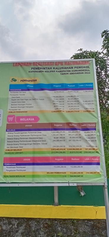 Laporan Pertanggungjawaban Realisasi APBKal Tahun 2024 dapat diakses oleh masyarakat melalui banner yang terpasang di Balai Kalurahan Pengkol, website resmi Kalurahan Pengkol, atau masyarakat dapat menghubungi perangkat kalurahan untuk memperoleh penjelasan lebih lanjut.
